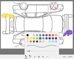 The “pen” and “highlighter” will impact the image as one would expect. The “blur” tool will blur the image contents. The “eraser” will remove the effect of the other tools.